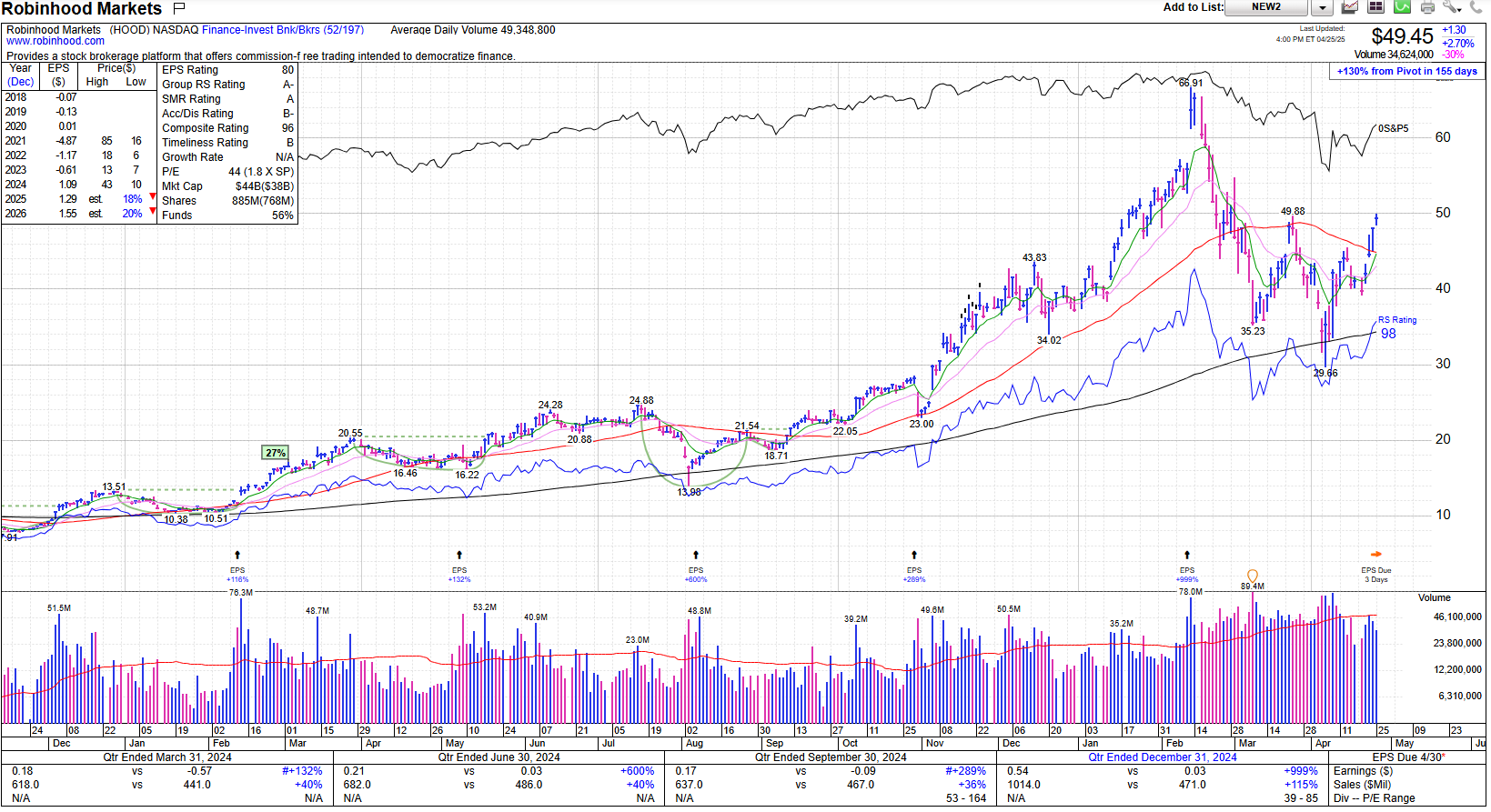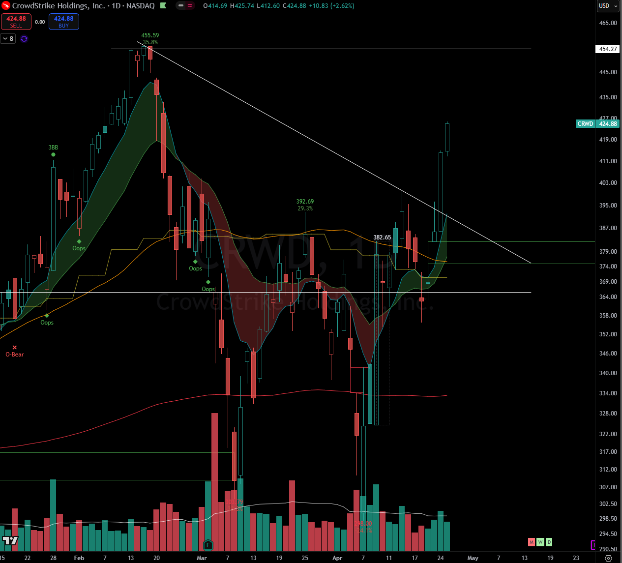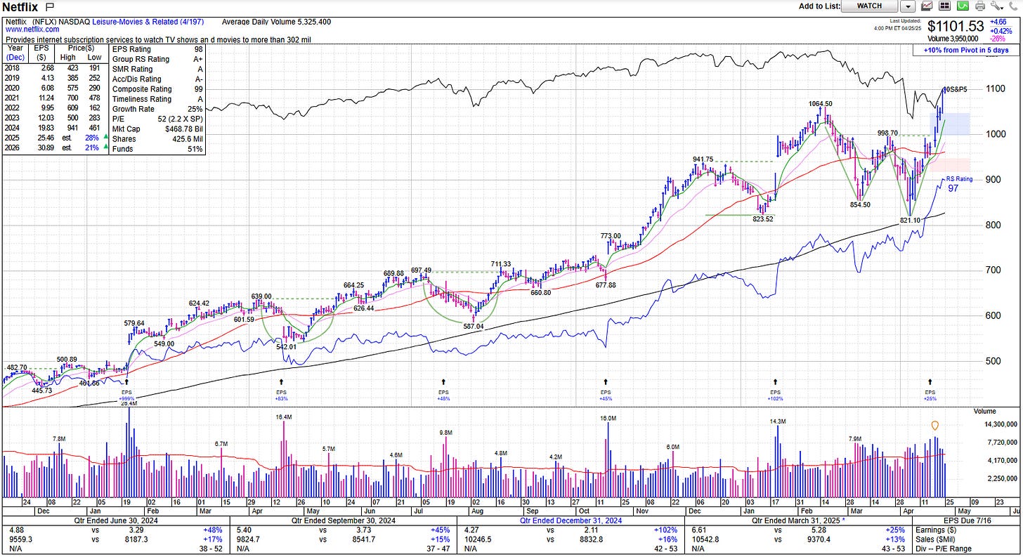 I was highly anticipating a bounce from a very oversold condition with such bearish sentiment. Once the FTD was confirmed on April 22nd followed by TSLA earnings that Tuesday evening, I noticed an important change of character after a dismal earnings report, the stock actually rallied after hours. When bad news starts to get faded, especially in corrections/bear markets, its often bullish as stocks have already discounted that news. Going into Wednesday, I was pretty aggressive in getting invested and became fully invested by Thursday. My main focus list was NFLX PLTR CRWD SPOT. However, I didn’t like how SPOT was acting, especially before earnings, so I kicked that name out for a small gain. I also trimmed some of my positions on Friday after great moves, taking profits to finance overnight risk, especially with potential headline volatility over the weekend. As of Week 17, my portfolio was evenly concentrated in NFLX PLTR CRWD.